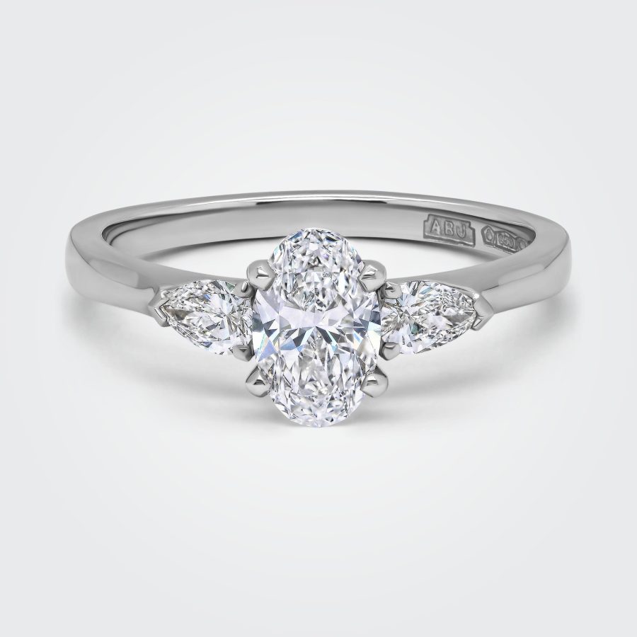 Whereas the traditional trilogy has three round cut diamonds, this design incorporates the well-admired pear cut, encapsulating style and beauty. Each stone hand chosen to ensure the sparkle and quality matches to perfection.