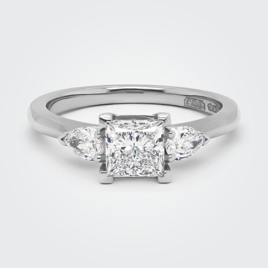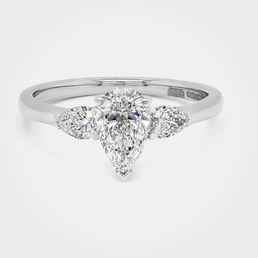 This elegant and admired collection of diamond trilogy engagement rings features a centre stone flanked either side with matching pear cut polished diamonds. The three stones in a trilogy engagement ring resembles the past, present and future, all the dimensions which make a marriage unique and so powerful.