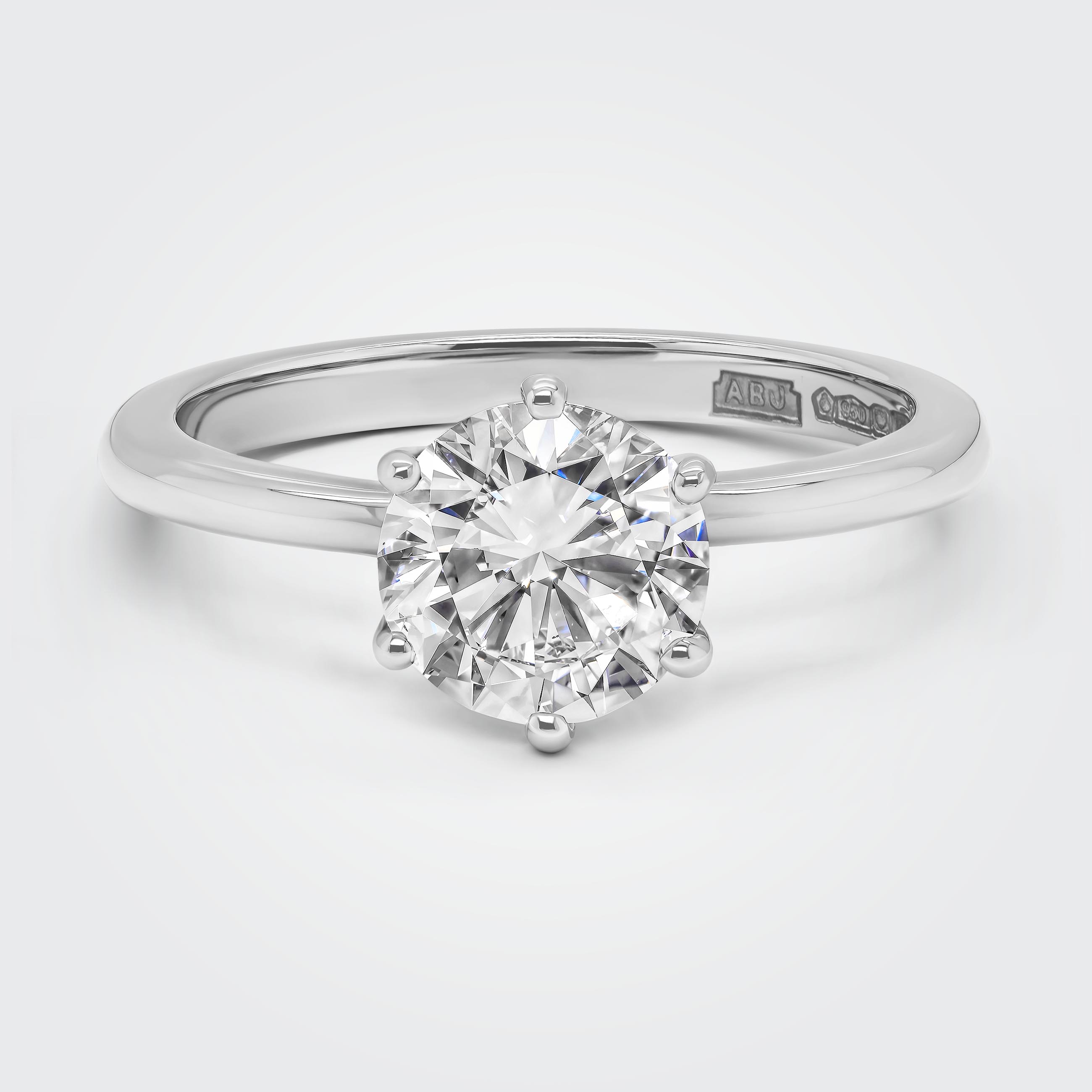 Round brilliant cut polished diamond, claw set in the most simplistic twist setting, the perfect match for the most classic cut of diamond. This engagement ring will sit flush next to any of our wedding bands, whether plain or diamond orientated like the 2.5mm rounded court design band shown. The centre diamond shown is 1.50ct in size (7.2mm x 7.20mm), the width of the ring is 2.2mm with an approx total weight of 3.8 grams in 18ct gold and 4.8 grams in platinum. For 18ct Gold (rose, white or yellow), the ring will be hallmarked 750 inside the ring and 950 for platinum.