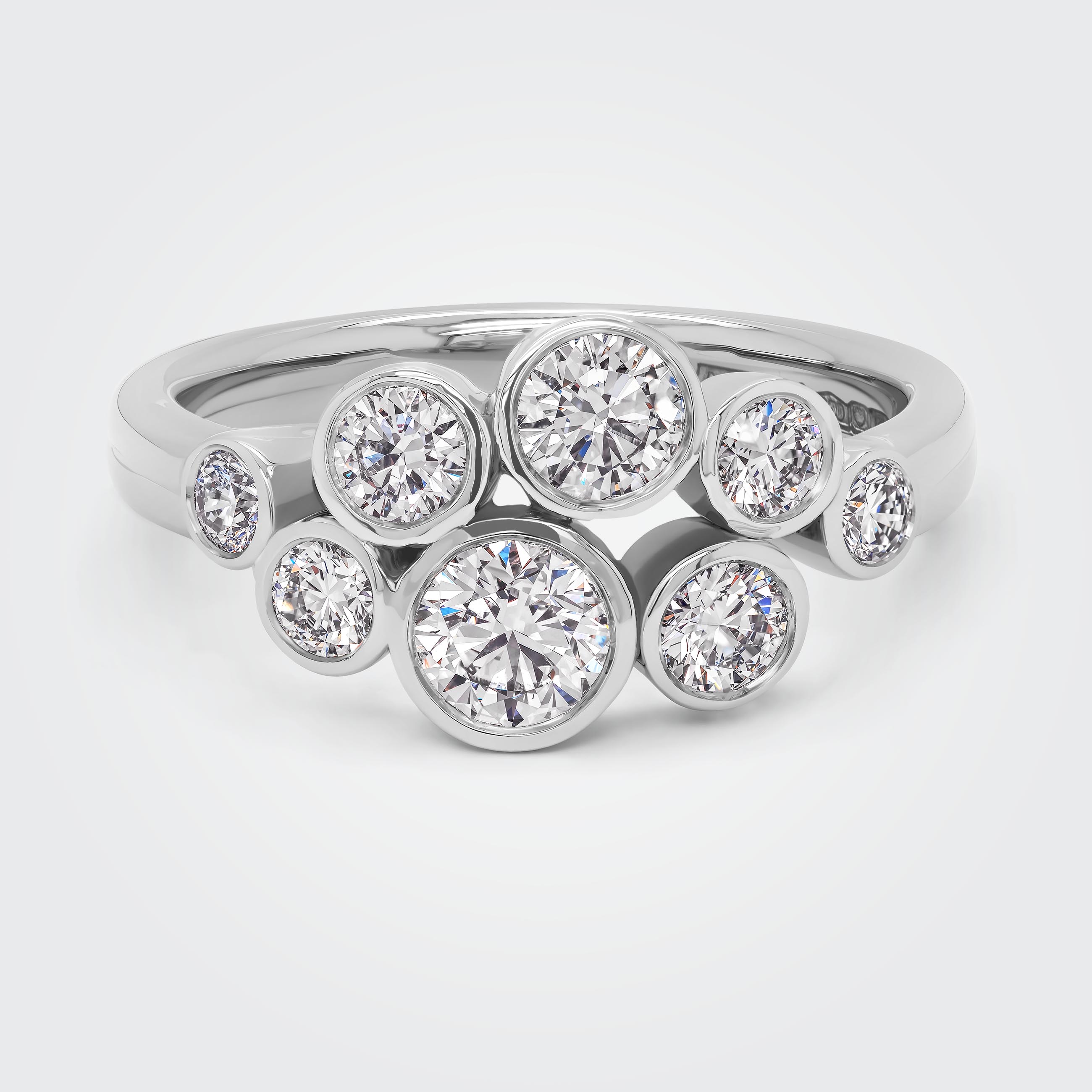 Matching round brilliant cut polished diamonds, 1.30ct total, rubover set magnificiently in the most classic of rubover settings, on a stylish half eternity design platinum ring.