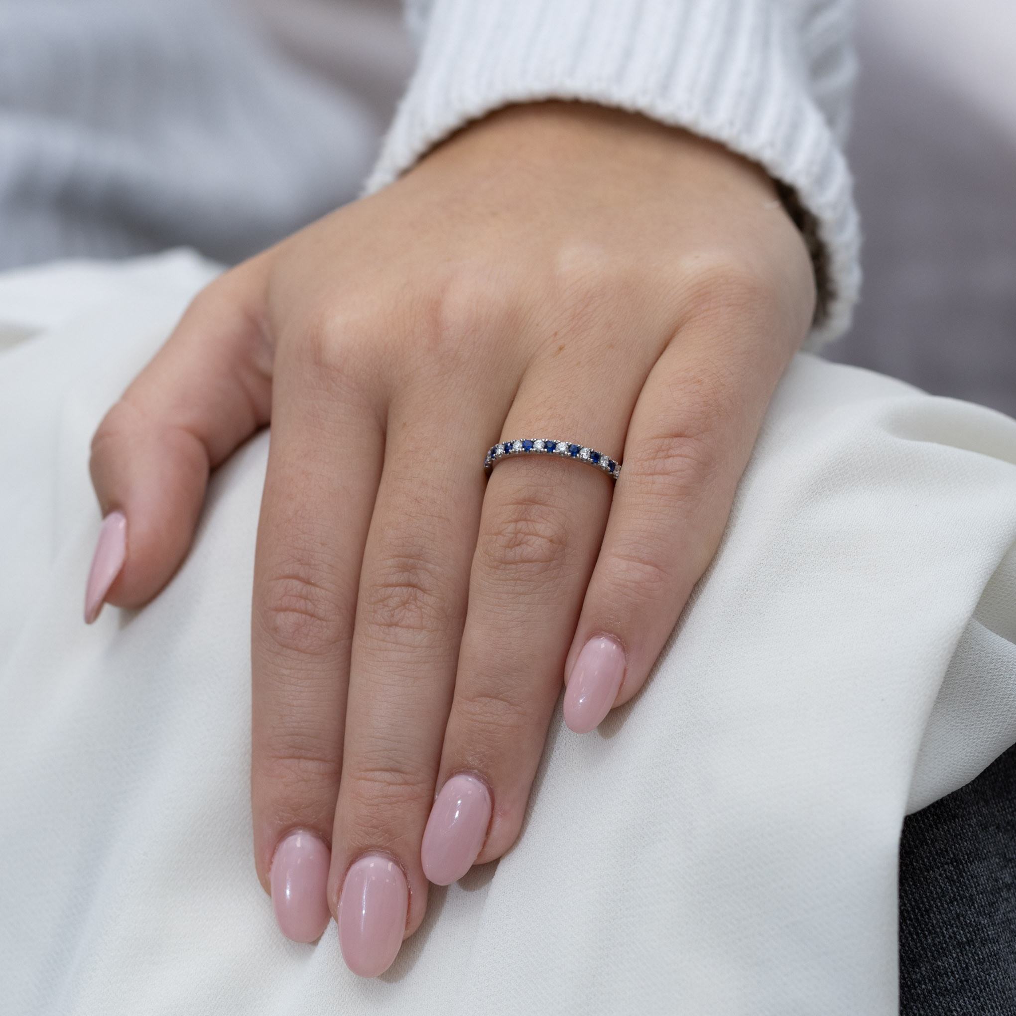 Matching round brilliant cut polished diamonds and blue sapphires alternatively set in a platinum wedding band. The total diamond weight is approx 0.15ct, with a colour G and clarity of VS. The total sapphire weight is approx 0.15ct.