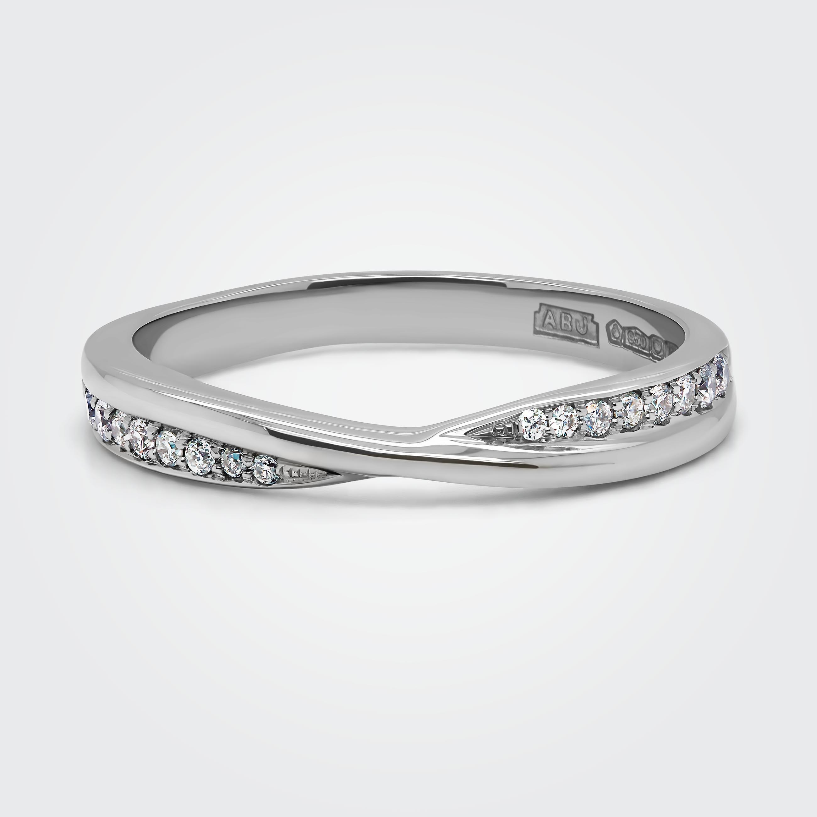 Matching round brilliant cut polished diamonds thread set on a twisted platinum wedding band. The band width is 2.2mm and the total diamond weight is 0.10ct with a colour of G and a clarity of VS. This band will sit flush next to any of our engagement rings. The ring will be hallmarked inside the band with our hallmark 950.