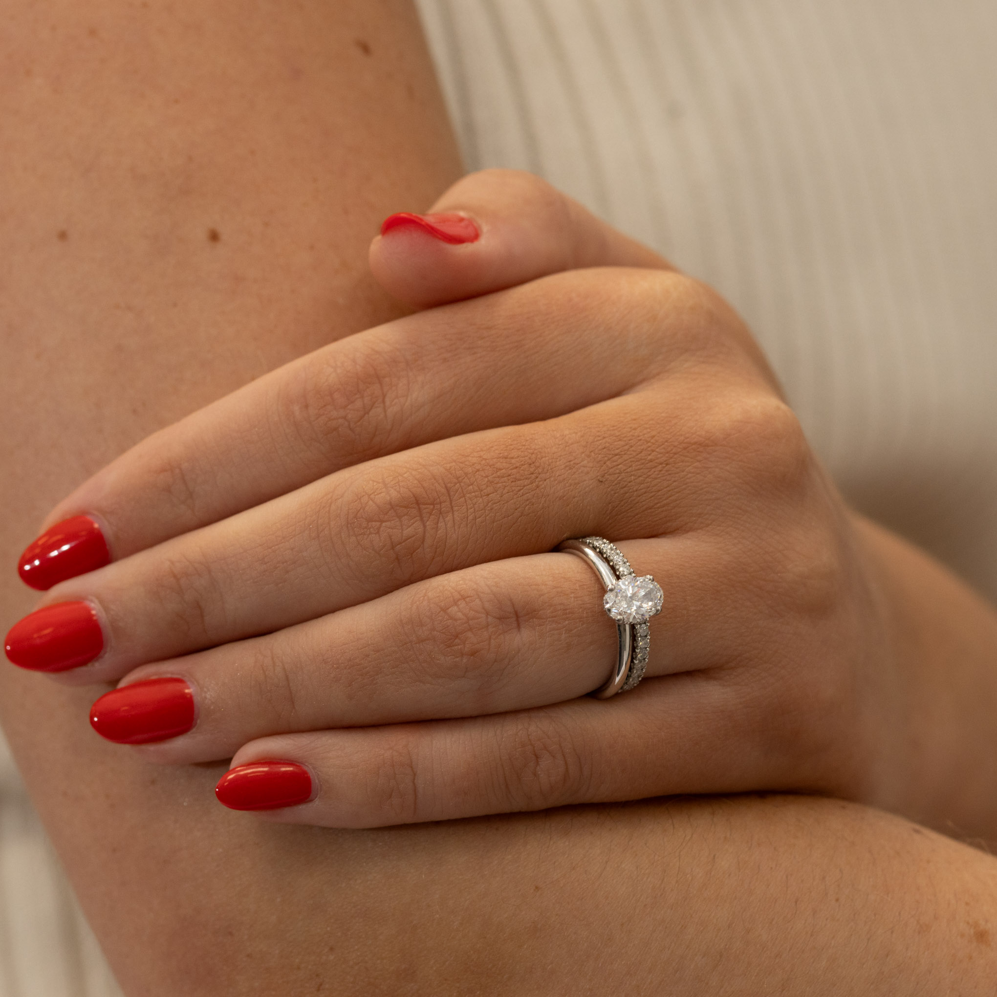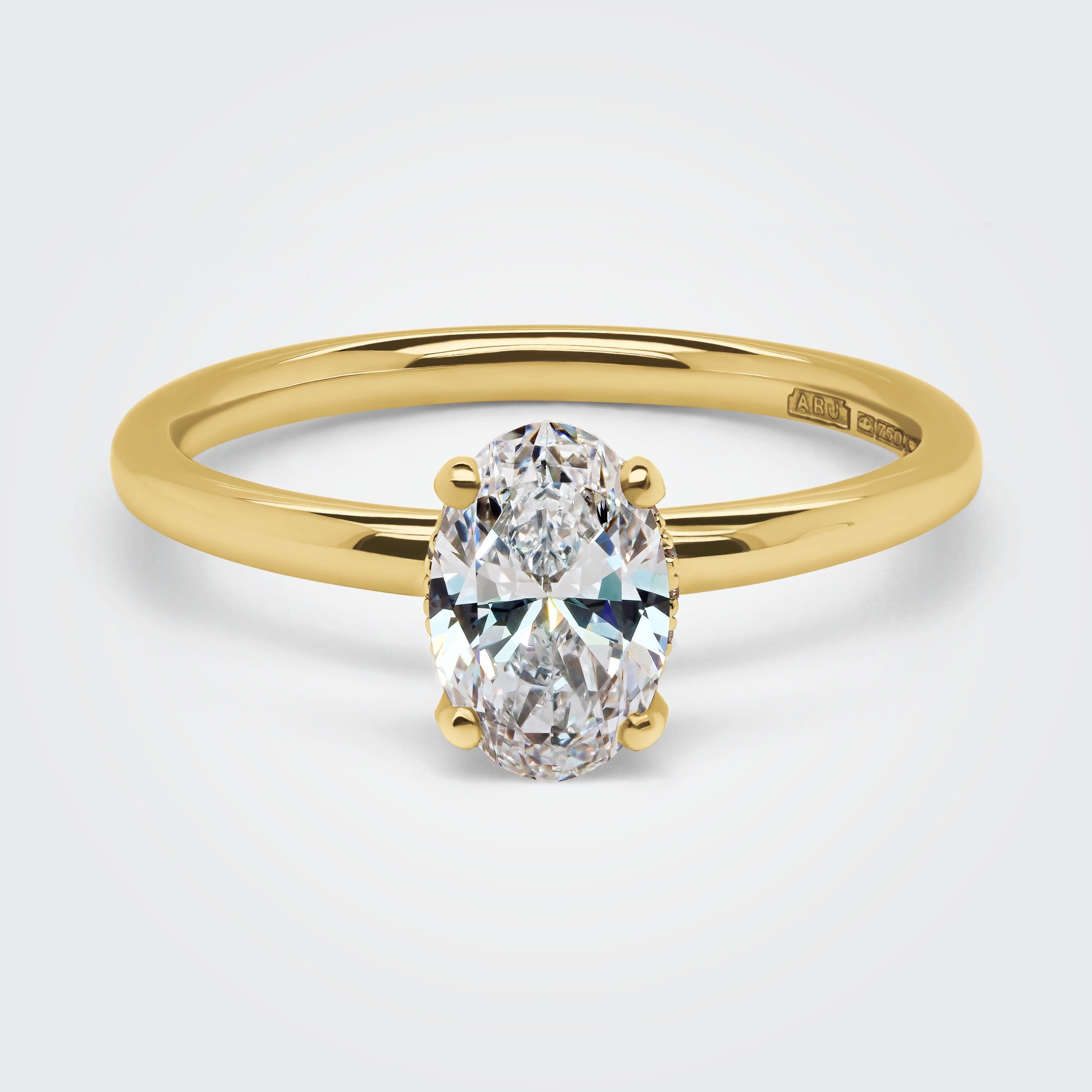 Oval brilliant cut polished diamond claw set with round brilliant diamonds set underneath the centre stone on a hidden halo, hand selected to match the quality of the centre stone. This ring will sit flush next to any wedding band, including the Camille diamond wedding band as shown. The centre diamond shown is 1.00ct in size (8.6 x 5.5mm) with the total hidden halo diamond weight of 0.04ct, F VS quality. The width of the ring is 2mm with an approx total weight of 3.2 grams in 18ct gold and 4.1 grams in platinum. For 18ct Gold (rose, white or yellow), the ring will be hallmarked 750 inside the ring and 950 for platinum.